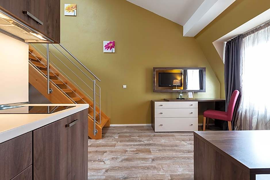 The studio provides soundproof walls, a wardrobe, as well as a private bathroom featuring a bath or a shower and a hairdryer. Meals can be prepared in the well-fitted kitchenette, which comes with a stovetop, a refrigerator, kitchenware and a microwave. The studio offers a safe deposit box, an electric kettle, parquet floors, a flat-screen TV, as well as garden views. The unit offers 2 beds.